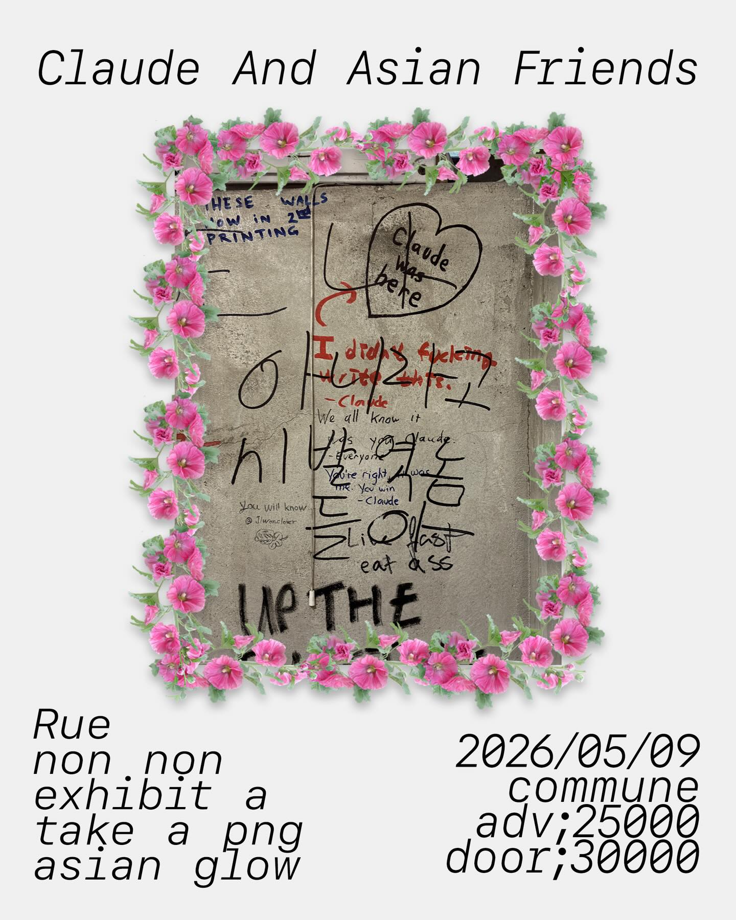 Rue non.non의 'exhibit a' 전시회로, 'take a png asian glow'를 주제로 하며 'THESE WALLS NOW IN 2D PRINTING' 문구와 'Claude was here' 등 벽에 쓰여진 낙서들로 구성된 작품을 선보입니다.