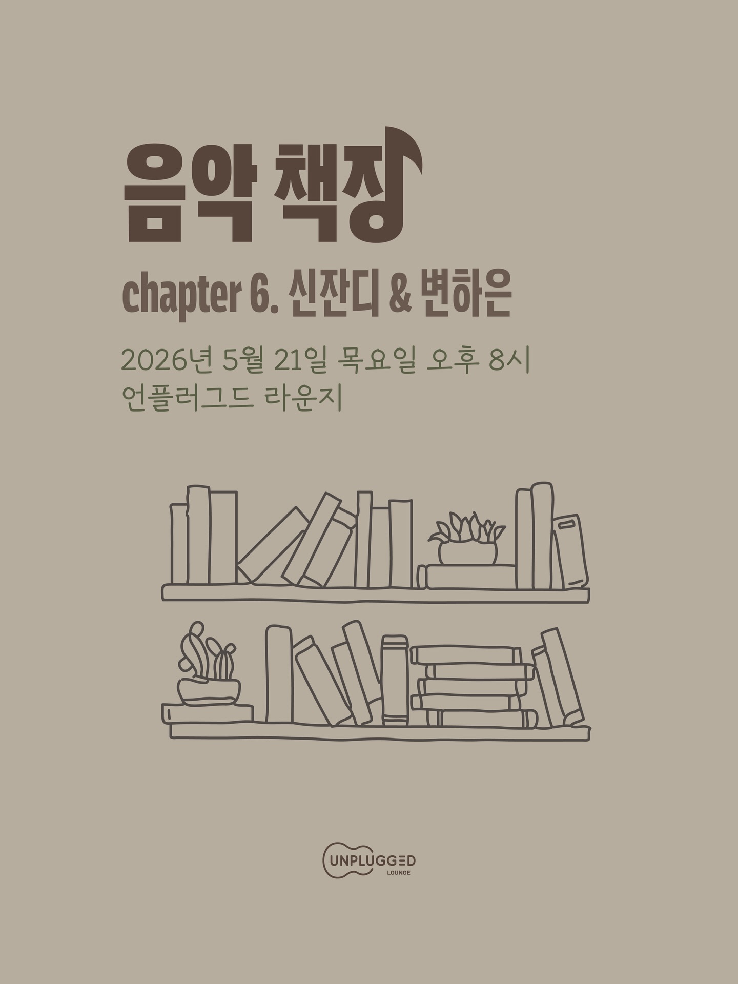 음악 책장 시리즈의 여섯 번째 공연으로, 신잔디와 변하은이 언플러그드 라운지에서 라이브를 선보입니다.